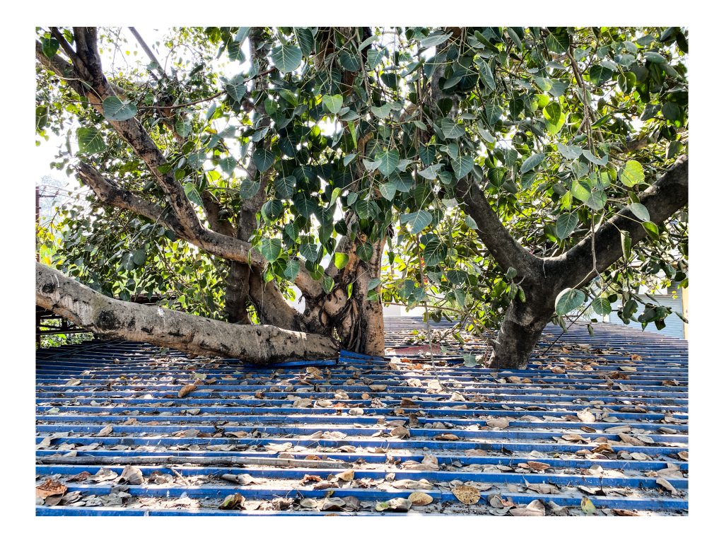 A once-free, ever-giving peepal tree stands here, its thick branches forced to push through narrow gaps in a sheet of metal roofing that humans have laid around it. The corrugated blue sheets press against its trunk, cutting into the natural space it needs to breathe, expand, and grow. The tree bends and twists unnaturally, as if struggling to escape a cage. Dry leaves scattered across the roof look like silent witnesses to its suffering.